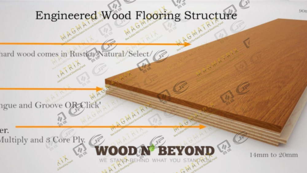 Múltiplas camadas unidas em um padrão de grão cruzado compõem a madeira de engenharia, o que melhora a estabilidade dimensional. A estrutura possui uma camada superior de folheado de madeira (2-5 mm de espessura) conectada a várias camadas de madeira compensada. Esta construção exclusiva cria um produto mais forte e mais rígido que a madeira maciça. A maioria dos produtos vem com bordas de língua e escala. Muitos fabricantes agora usam sistemas de bloqueio de cliques para facilitar a instalação.